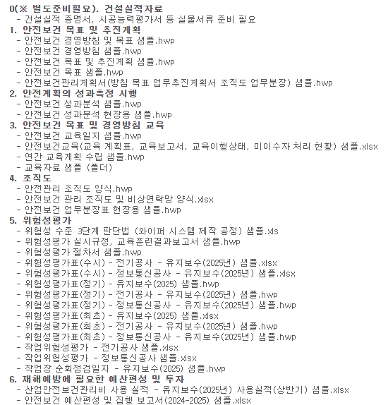 그래서 저는 준비할 때, 안전보건관리 문서를 낱장으로 모으기보다 패키지로 처음부터 흐름을 고정합니다. 특히 신생기업·스타트업·중소·중견 건설/유지보수 업체는 평가 일정이 갑자기 잡히는 경우가 있어, 미리 안전보건관리 문서 세트를 세팅해두면 SA평가 보고서 대응 난이도가 확 내려가요. 무엇보다 설립 5년 미만 회사들은 사업이 커질수록 발주처 요구가 강해져서, 위험성평가와 교육 증빙이 “갑자기” 필요해지는 순간이 옵니다.